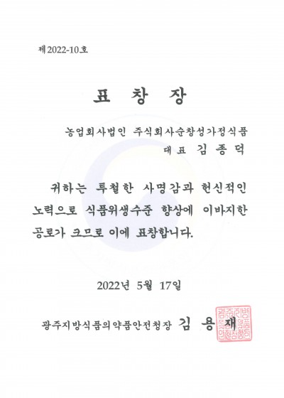 표창장(식품위생수준 향상)