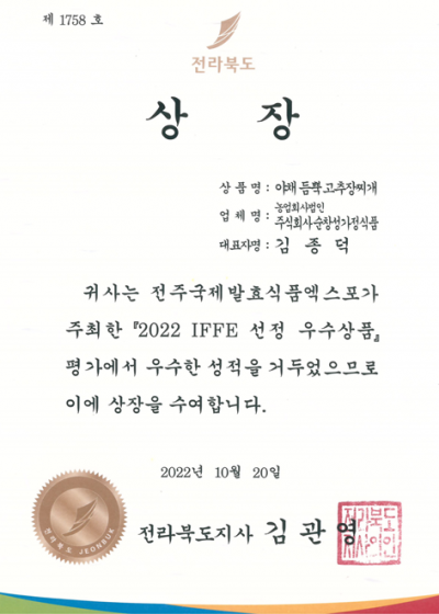 IFFE2022 전주국제발효식품엑스포 지정 우수상품 수상