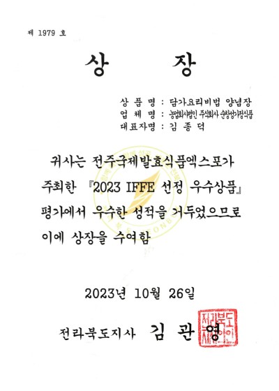 IFFE2023 전주국제발효식품엑스포 지정 도지사상 수상