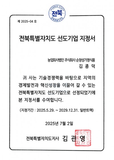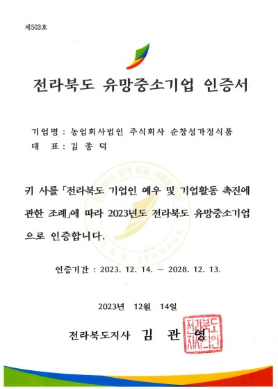 전라북도 유망중소기업 인증서