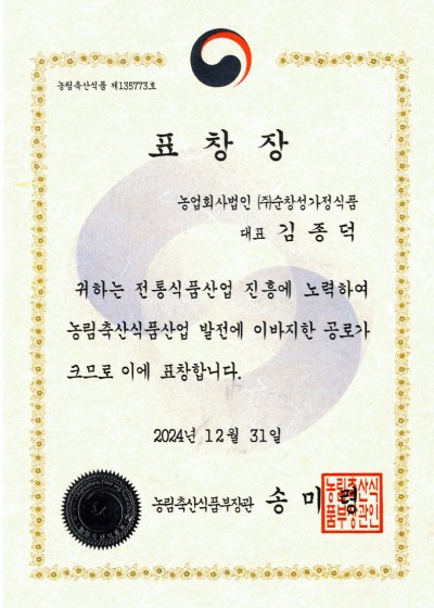 농림축산식품부장관상(전통식품산업 진흥) 수여